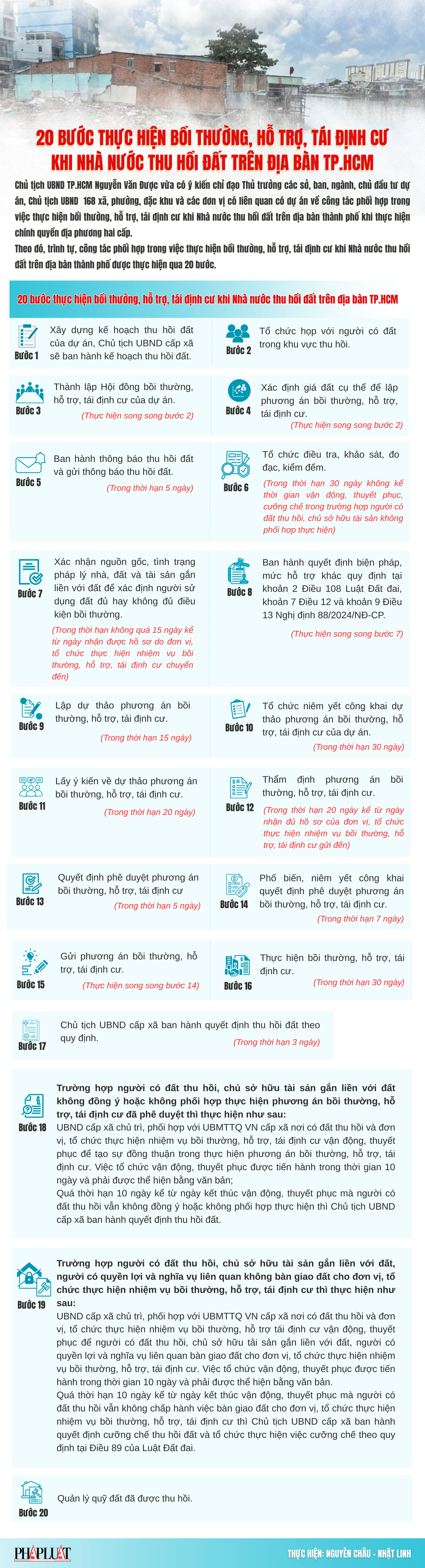 Trình tự, công tác phối hợp trong việc thực hiện bồi thường, hỗ trợ, tái định cư khi Nhà nước thu hồi đất trên địa bàn TP.HCM được thực hiện qua 20 bước.